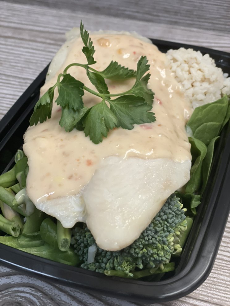 4 oz. tilapia meal prep with carb, veggie and side sauce.